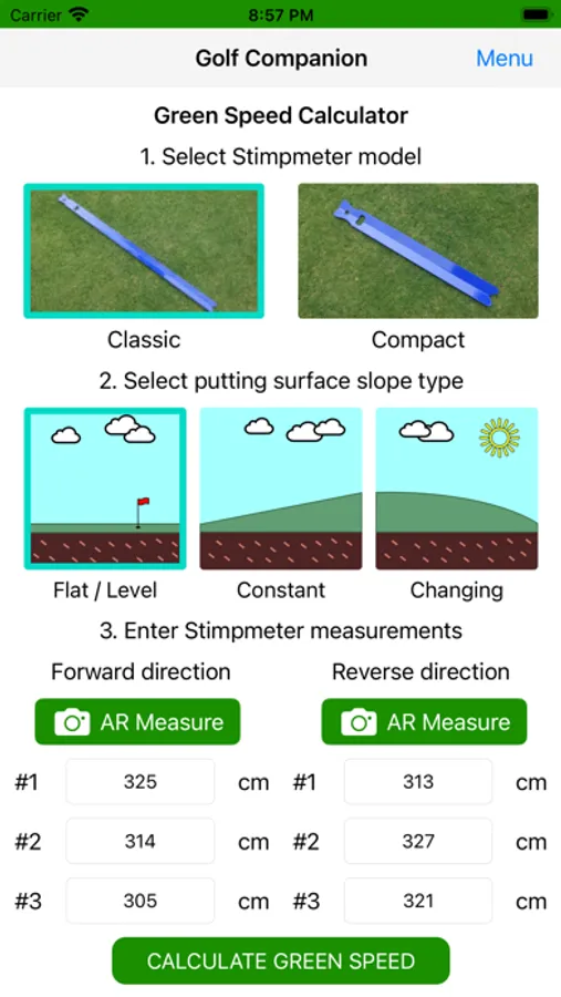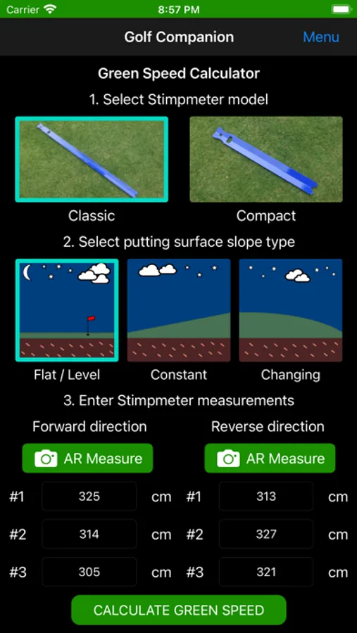 Capable of calculating green speeds for both flat and sloping greens. For flat greens a simple averaging method is used, whereas for sloping greens the Brede equation is employed.