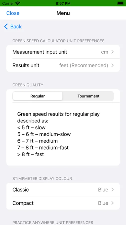 A green speed calculator to calculate putting green speeds when using a Stimpmeter/Speedmeter. Designed for both green keepers and golfers.