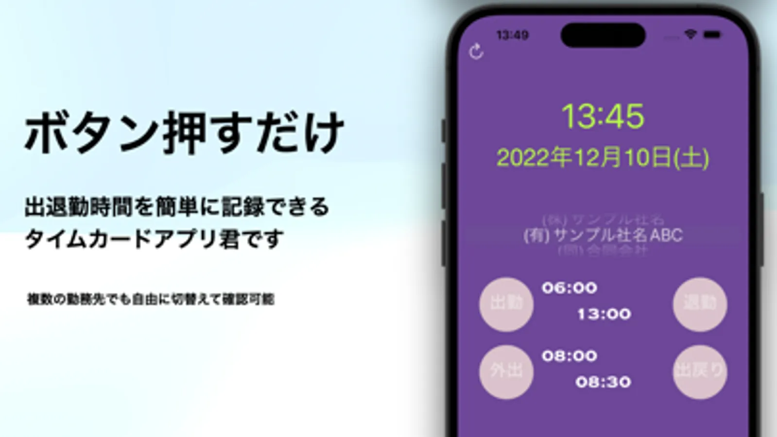 ー選択した勤務先に対してボタン押すだけで、出勤時間・退勤時間・外出時間・出戻り時間を簡単に即時記録する