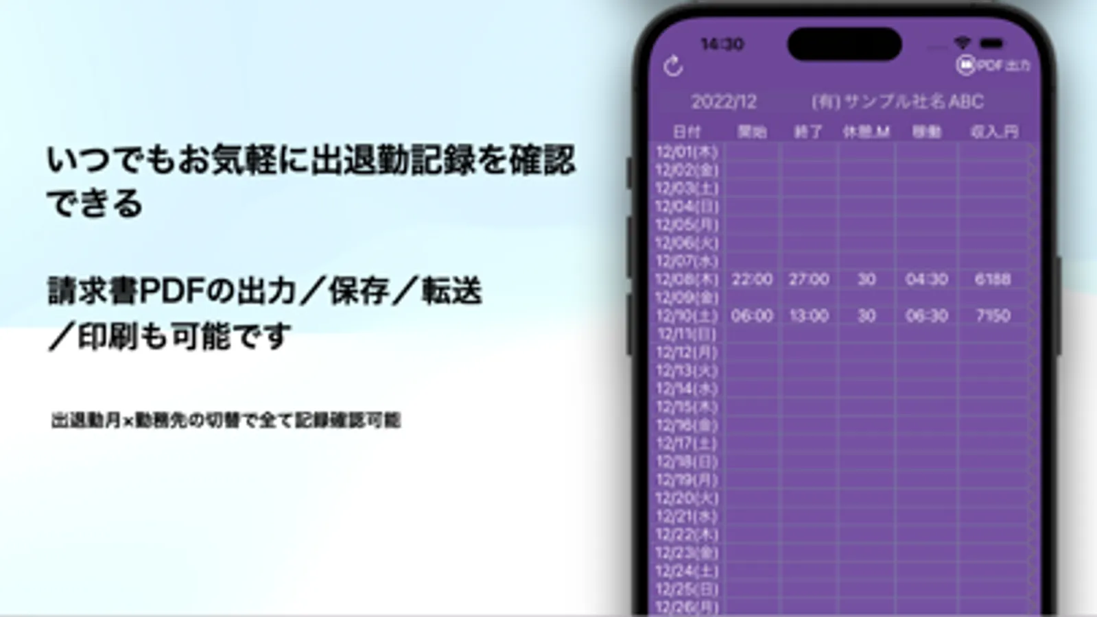 ・フル出力(稼働時間以外に日々収入金額、月間合計金額、出勤日数、交通請求なども含め)