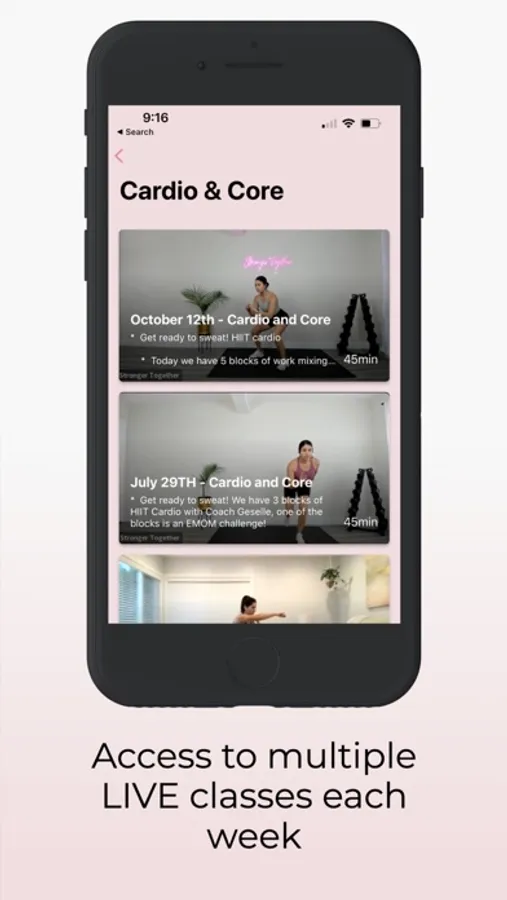 Access to multiple LIVE classes each week. Classes include upper/lower/full body strength training, Cardio HIIT training & deep stretching. Our coaches provide optional challenges + modifications so that you can customize the workout to your ability.