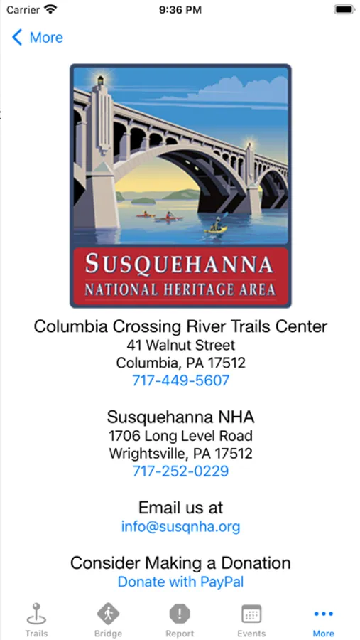 Use this app to access Susquehanna National Heritage Area information as well as information about trails along Susquehanna River through Lancaster and York Counties. Provide feedback about maintenance issues. Get notifications of closures, construction, or other trail improvements. As one of 55 National Heritage Areas and 12 Pennsylvania Heritage Areas, Susquehanna National Heritage Area tells the stories of our region and raise the profile of our area to attract visitors from near and far.
