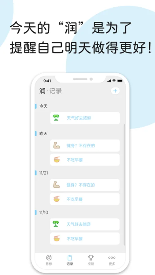 来“润”app记录你每天的真实想法!人不是机器,没有必须的循规蹈矩,总有想“润”的时候,不必害怕,大胆的记录下来,今天的“润”是为了提醒自己明天做得更好!