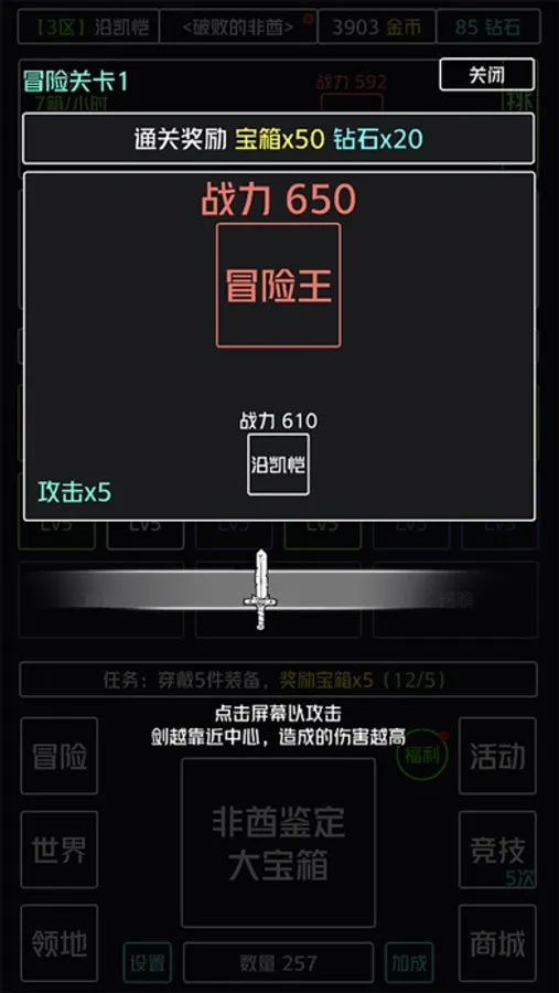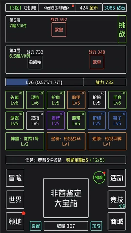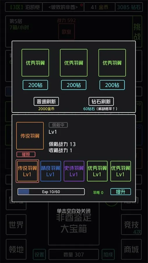 本作是一款放置养成的爬塔游戏,目标就是不断提升战力,挑战欧皇(本作boss一律命名为欧皇,痛扁欧皇便是游戏奥义)