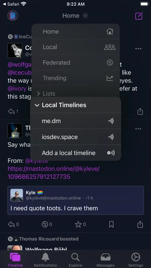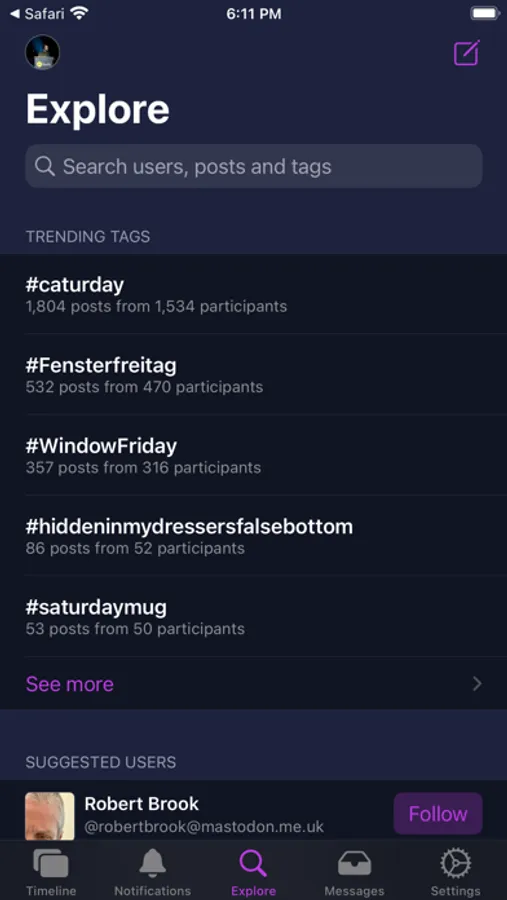 - The timeline is also live, this app is connected to the powerful streaming API of Mastodon so you won't miss any content!
