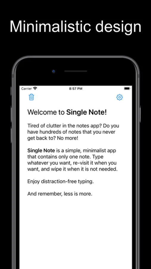 Single Note is a simple, minimalist app that contains only one note. Type whatever you want, re-visit it when you want, and wipe it when it is not needed.