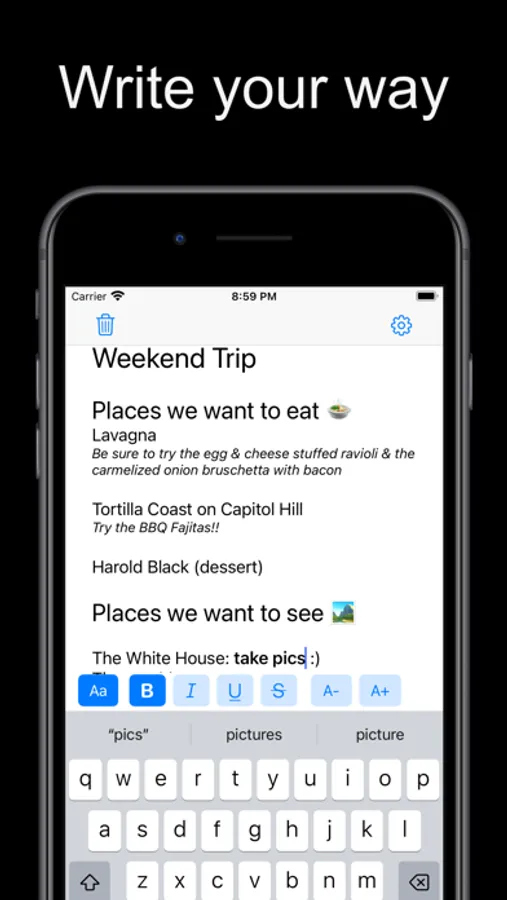 • Open the app and immediately start typing. No need to organize or store notes somewhere.