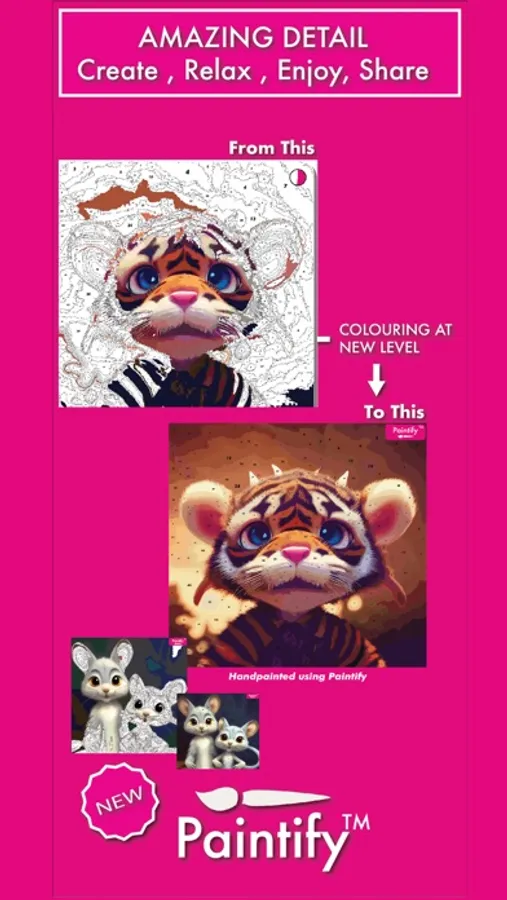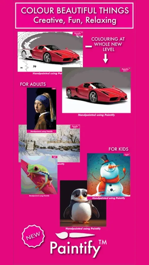 Paintify(TM) takes colouring and painting by numbers apps to a whole new level for kids and adults alike. With amazing details, you can create beautiful things. Using multi object painting, the colouring is even more satisfying. You can personalise your creations and share as gifts that are better than cards for birthdays, Christmas, halloween or just because you want to say thank you. Share with all your friends and family. Loads of paintings that are suitable for both kids and adults. From simple cartoon and scenes to painting famous oil paintings and your favourite cars. New creations added regularly and daily. Create, relax and share.. colour your way to a relaxed state with soothing music to enhance your experience while you create your masterpiece. How many can new masterpieces can you achieve ? .. Enjoy