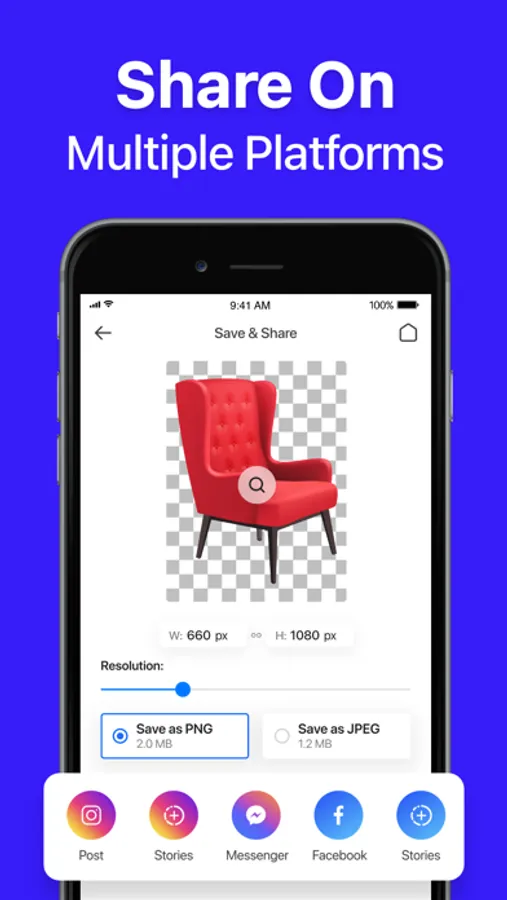 • Change resolution before saving your edited photos in PNG or JPEG format