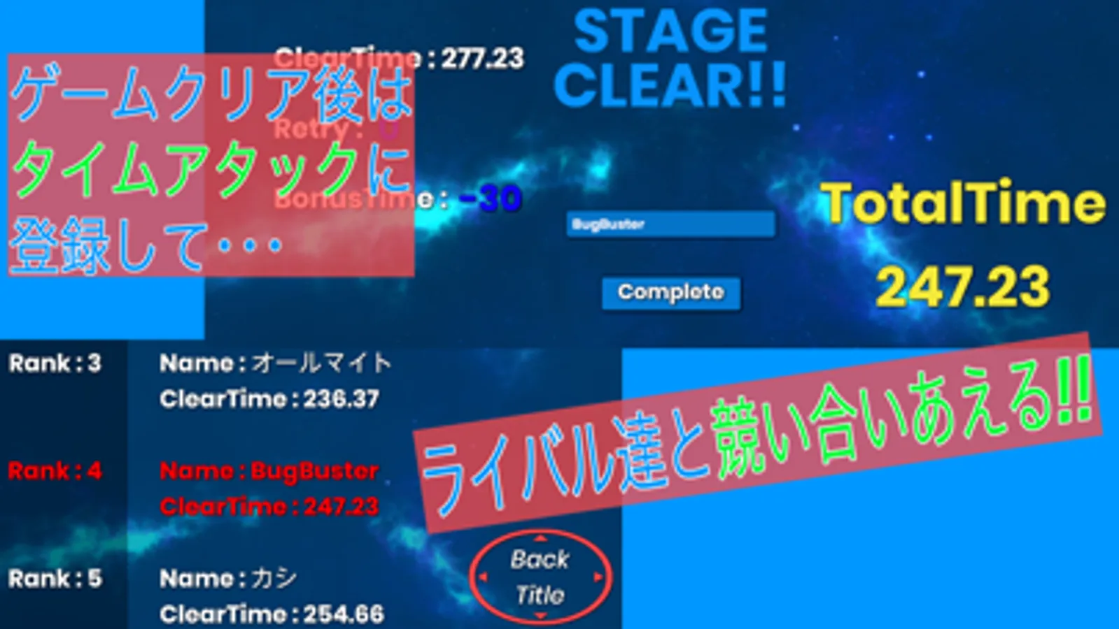 ゲーム攻略後には攻略タイムが表示されます。自分のニックネームなどを入力し送信する事で上位10名まで表示されるタイムスコアランキングに参加できます。