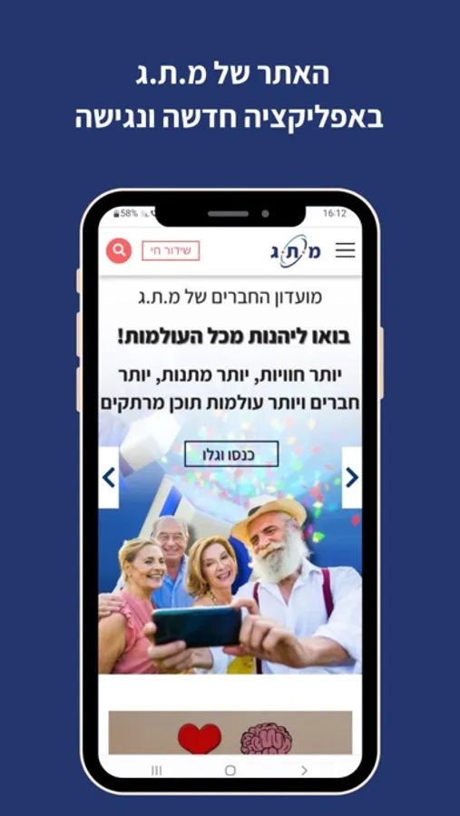 מ.ת.ג הינה אפליקציית תוכן, פנאי ותרבות חברתית ייחודית המיועד לבני 60 פלוס. באפליקציה הושקעו משאבים רבים אשר הותאמו לציבור הקהלים המבוגרים בדגש על חווית משתמש קלה ונעימה.