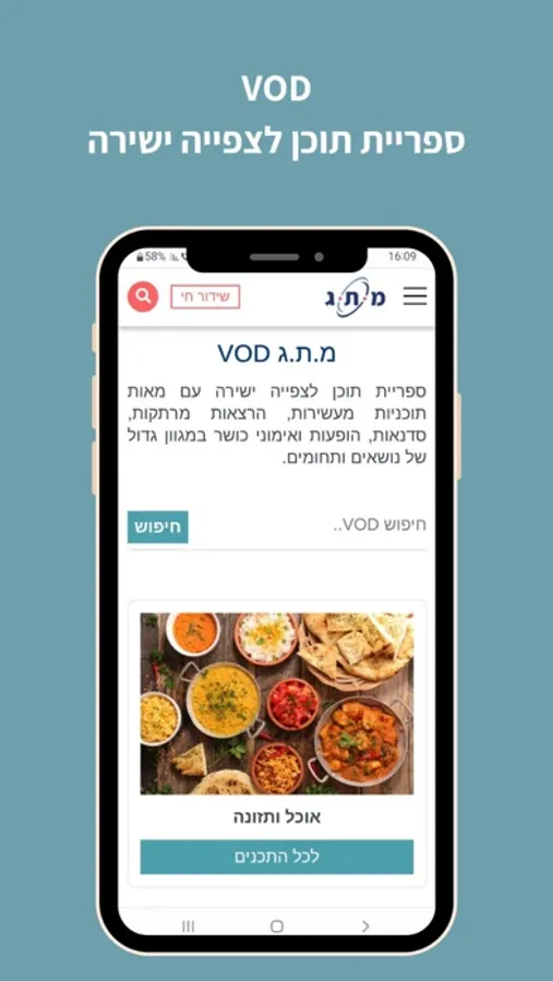 במ.ת.ג תמצאו ערוץ שידור יומי ולוח שידורים עשיר ומגוון, ספריית VOD עם אלפי תוכניות, סדרות והרצאות מרתקות בגוון גדול של תחומים ידע ועניין. קהילות חברים ותוכן, טיולים וסיורים מודרכים ברחי הארץ, קורסים וסדנאות עם מיטב המרצים ואנשי התוכן, מפגשים ופעילויות תוכן פנאי ותרבות.