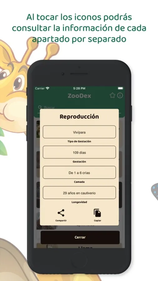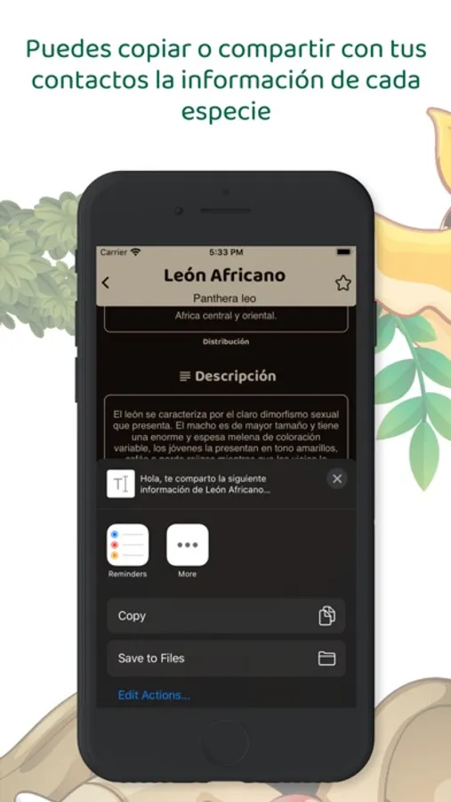 También puedes copiar o compartir con tus contactos la información de cada sección por separado o la información completa de cada especie.