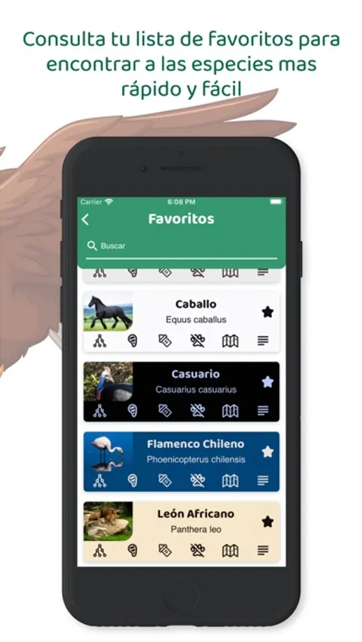 Puedes consultar cada sección por separado al tocar los iconos que se encuentran debajo de cada especie o al tocar la especie podrás consultar la información completa.