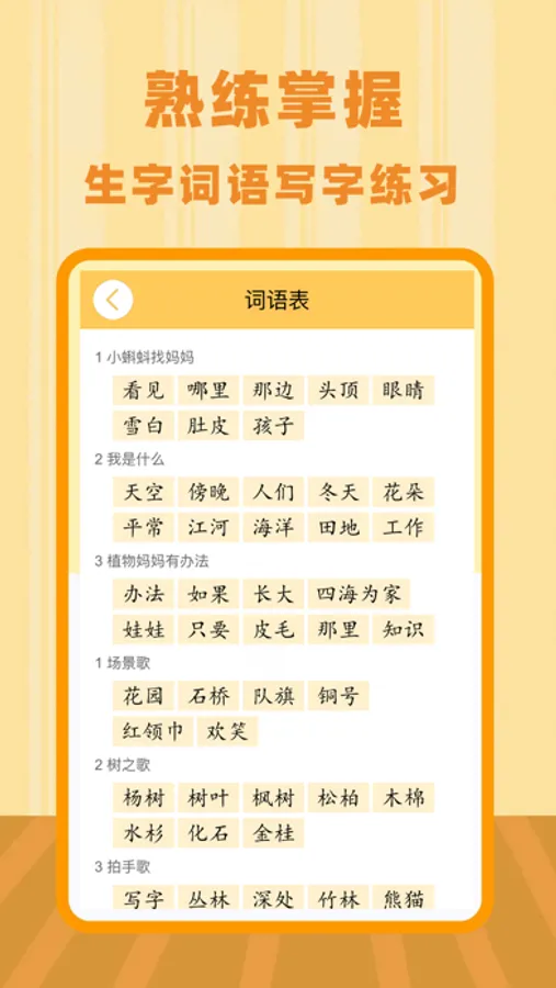 涵盖二年级语文上册教材全部学习内容,让您全面掌握拼音字母、生字、词语、句子、课文、故事、诗歌等课程内容,让孩子在轻松快乐中学习!