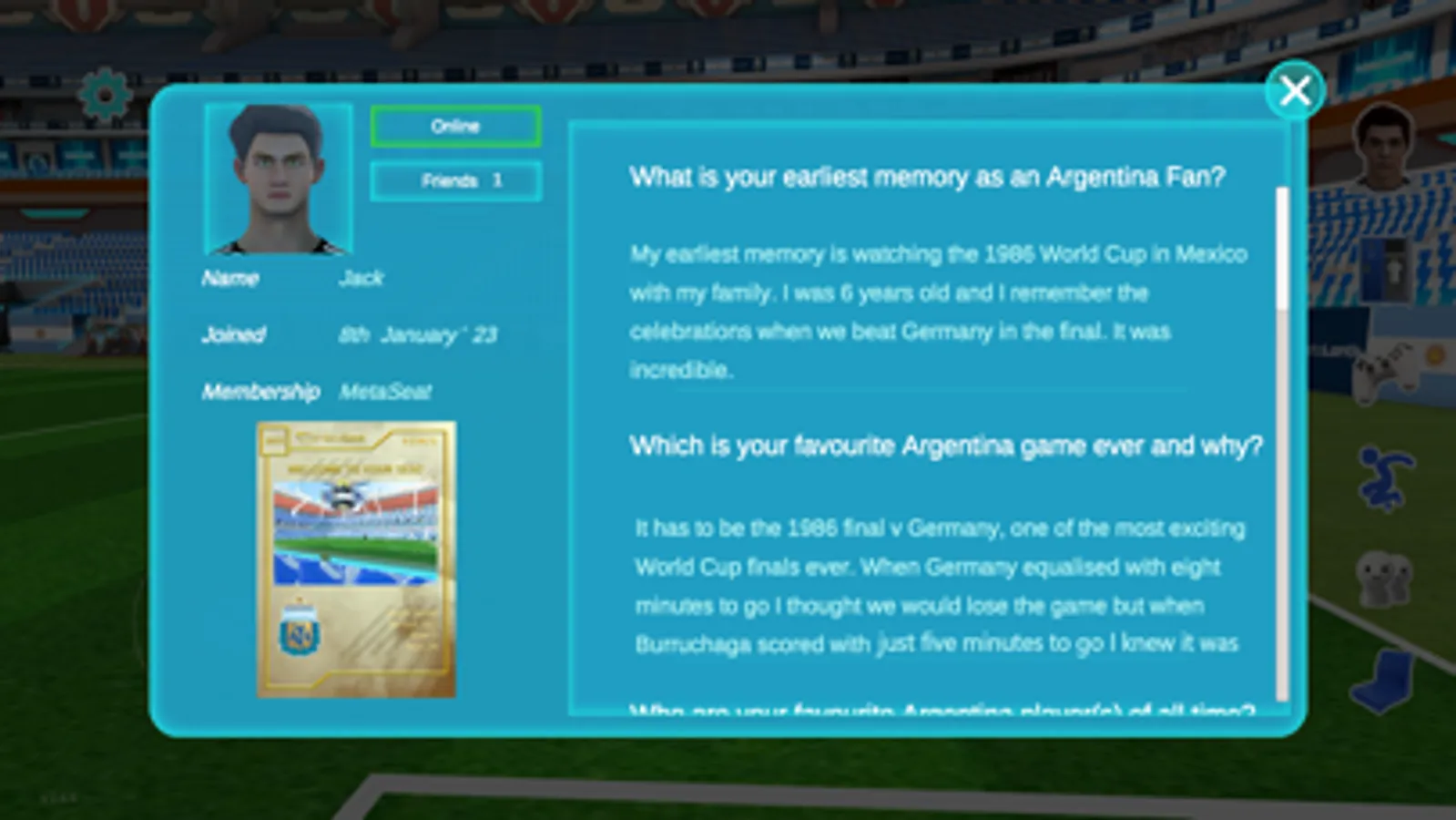 ● Live chat, real-life like actions and unique tools and accessories (team jerseys, flags, flare, drums, tattoos …) for your avatars bring the unique digital you to life.