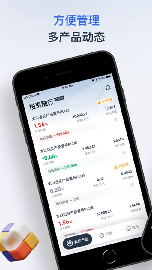 投资随行APP是大道一以发布的基于太以远见资产管理平台的移动APP终端,为私募基金经理和管理人定制,方便其快速了解所管辖产品的单位净值、日涨跌幅、产品净值、当日收益等相关产品的整体情况。产品详情中,提供了当日盈亏Top5、持仓行业结构Top10、持仓明细、产品资产及分布等产品明细情况的汇总展示。能够让投资经理即使在外奔波,也能随时随地下达指令、把握产品动态、了解产品详情。