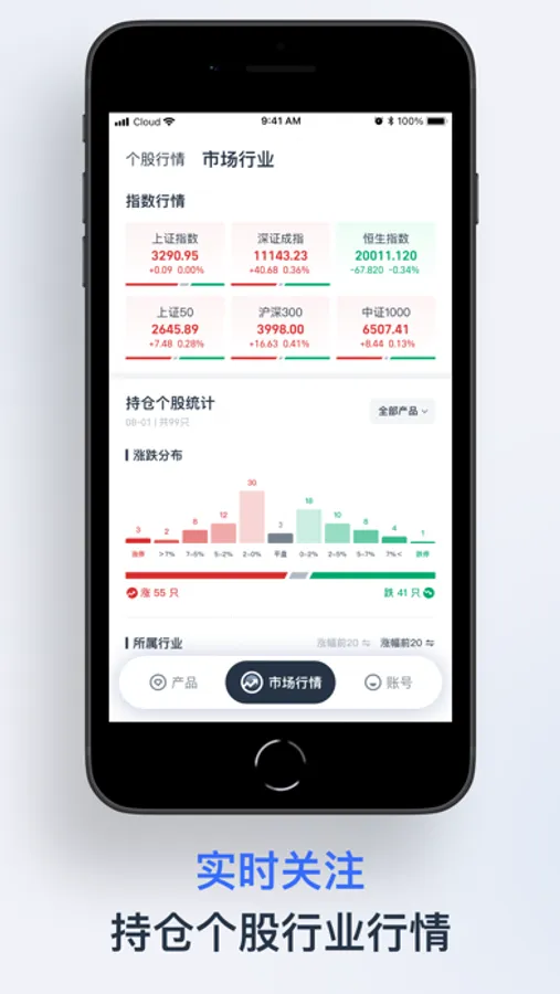 产品持仓:行业结构、当日盈亏、资产分布,一目了然;