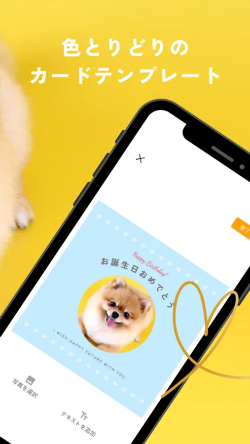 写真を選ぶだけで、キュートなデザインテンプレートと組み合わせて素敵なグリーティングカードが作れます。