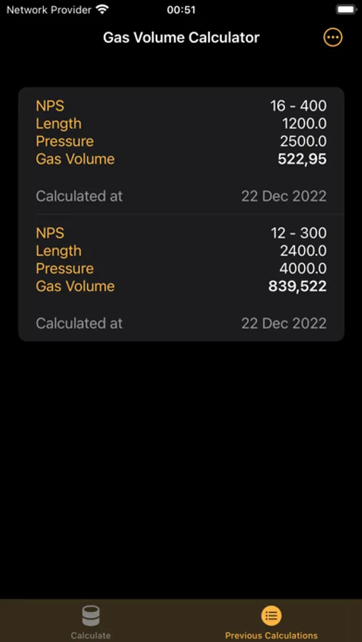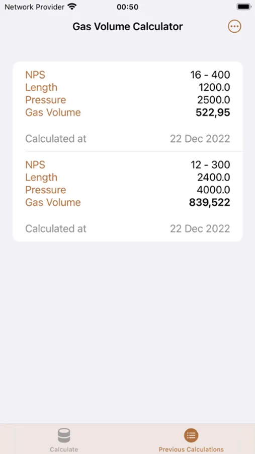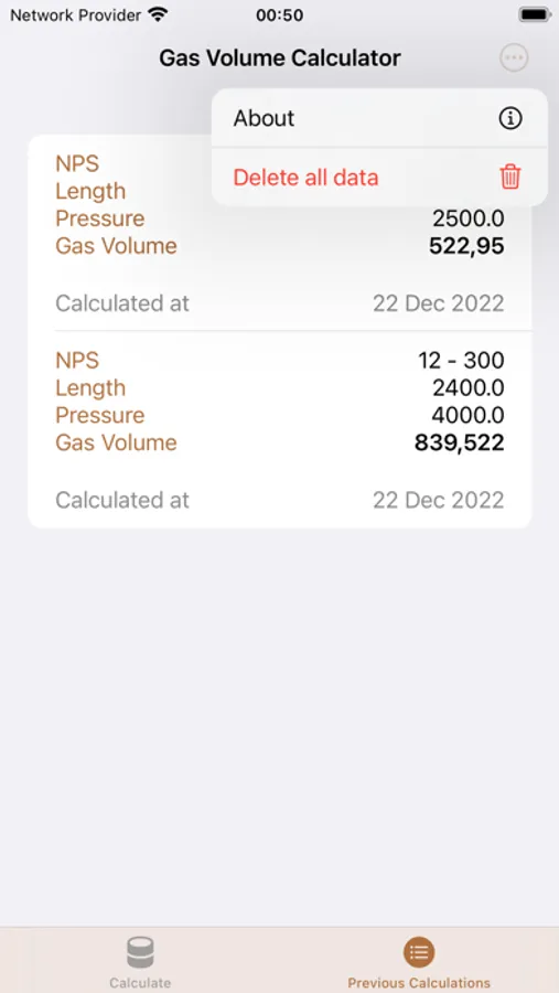 or selectively from the Previous Calculations tab by swiping left on a particular row.