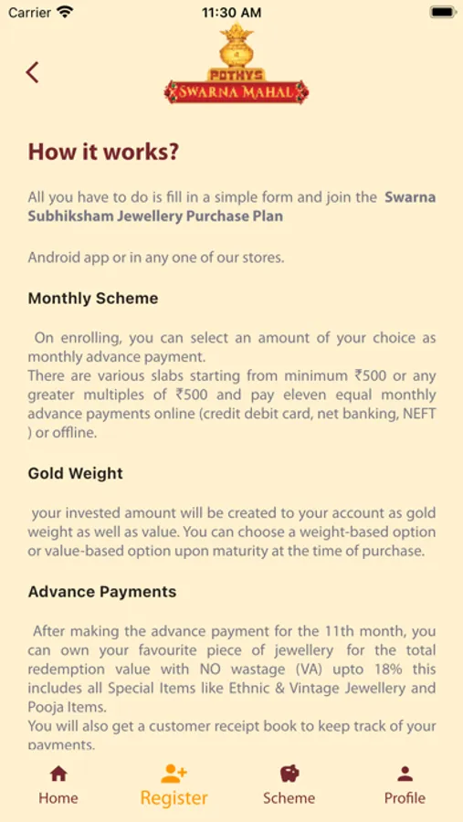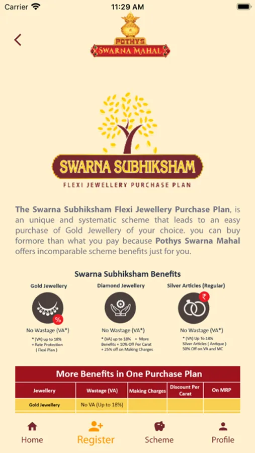The POTHYS Swarna Mahal Jewellery Purchase Plan is a unique and systematic plan that helps you plan and buy your wedding and special occasion jewellery. You can buy more than you pay for because Pothys Swarna Mahal offers incomparable plan benefits just for you!