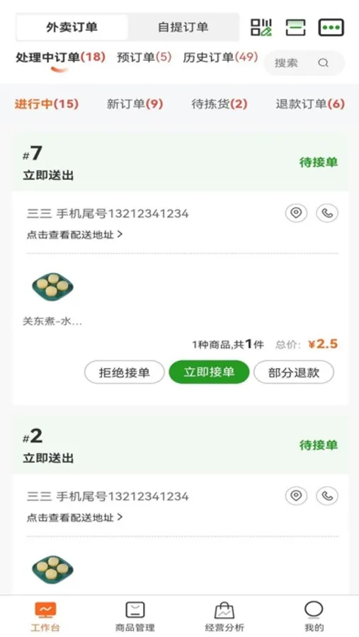 呈现唐久门店的所有新订单,历史订单,预订单聚合在同一页面,供门店随时随地轻松接单,快捷处理各种订单事物。