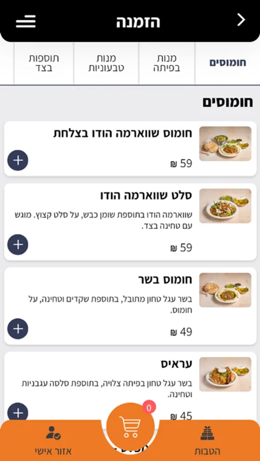 ב'חומוסים' תוכלו למצוא חומוס המוכן במקום מחומרי גלם משובחים. תהליך הכנת החומוס מקנה למנות המסעדה מרקם קטיפתי , טעמו העדין והייחודי אינו משרה תחושת כבדות לאחר אכילתו. למעט פול מצרי, גרגרי חומוס חמים, מסבחה, צנובר קלוי, תבשיל פטריות חמות וטחינה ייחודית, המסעדה מגישה שקשוקה ביתית, פלאפל מצוין, צ'יפס פריך וסלט ירקות קצוץ דק.