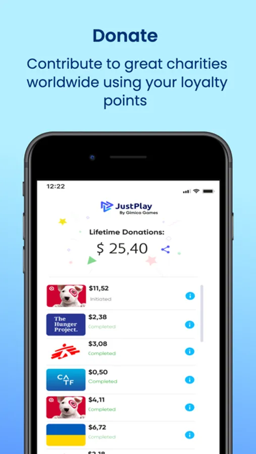 But it's not just about rewards. JustPlay is the only gaming loyalty program that lets you give back to the world. Choose to donate your earnings to major charities like The Hunger Project, Doctors Without Borders, and Clean Air Force, among others. For every donation you make, Gimica matches it, doubling your impact.