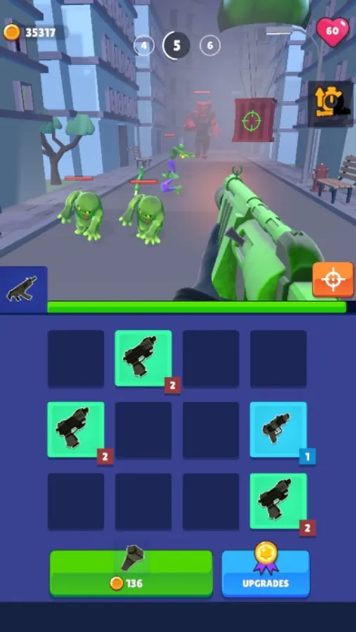 Collect your weapons. We're going to hunt zombies. Merge two weapons and create more powerful weapons. Zombies that get stronger each level will try to destroy you. Go against them and show everyone your shooting skills.