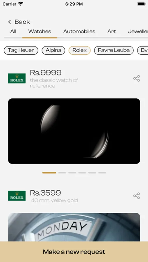 Order Luxury Goods Online: No need to rush to any store to buy luxury products. We brought luxury shopping at your figure tips. Customers can order Rolex watches to Super Cars from our Mobile Application.