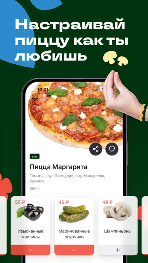 Зарегистрируйся в приложении и получи 3 пиццы по 1 руб. Оформи заказ на минимальную сумму, добавь в корзину бонусную пиццу, и получи ее за 1 руб.: к первому заказу — Пепперони, ко второму — Мясную, к третьему — Чизбургер. Не скрывай своих чувств и голода!