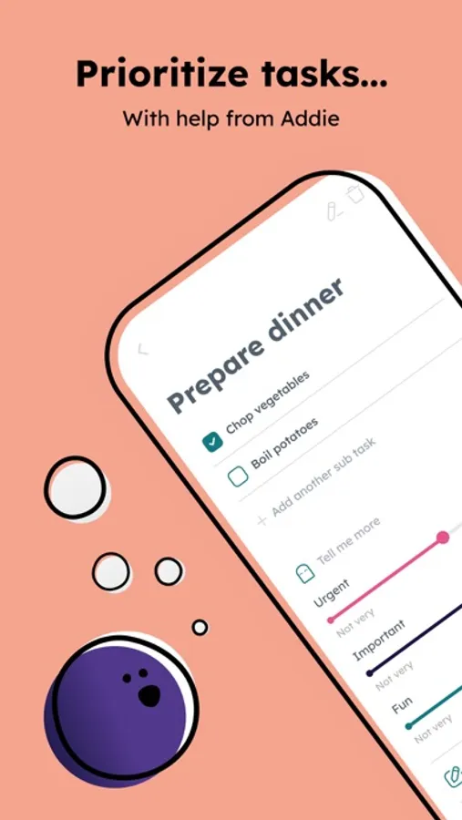 - Don’t know where to start? Addie helps you prioritise your tasks based on their urgency and importance, and crucially for people with ADHD, fun!