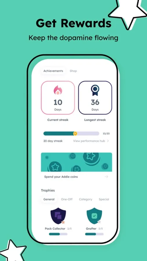 - Struggling with motivation? Addie’s gamification engine rewards you for completing tasks to keep the dopamine flowing and your motivation high. Unlock new features and achievements!