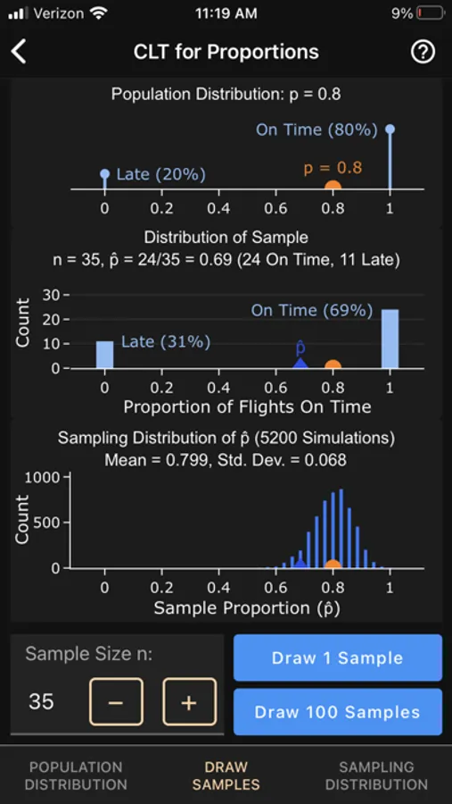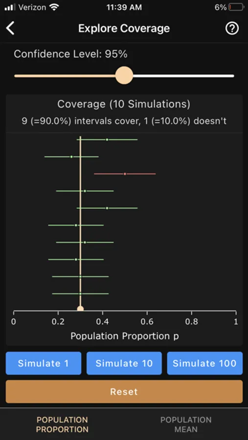 Coverage and Errors: Explore what 95% coverage for a confidence interval for a population mean or proportion implies.