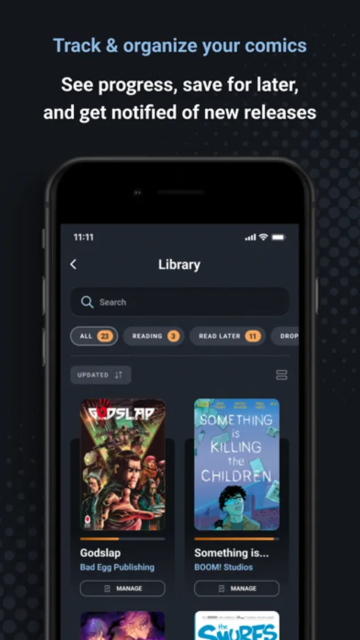 Bookmark your comics with statuses like “Reading”, “On Hold”, and “Read later” so you can pick it back up later or continue where you left off. You can even get notified when there’s a new release from your favorite titles.
