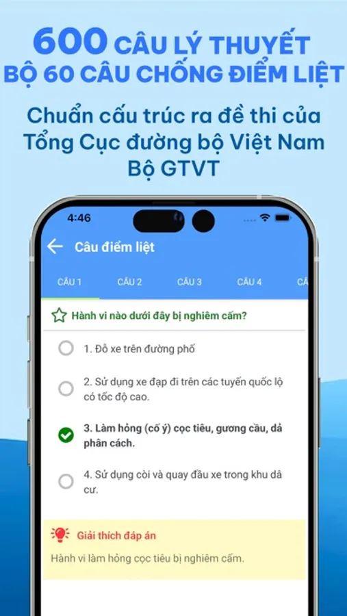 * Ôn thi GPLX với danh sách 60 câu hỏi điểm liệt được cung cấp riêng.