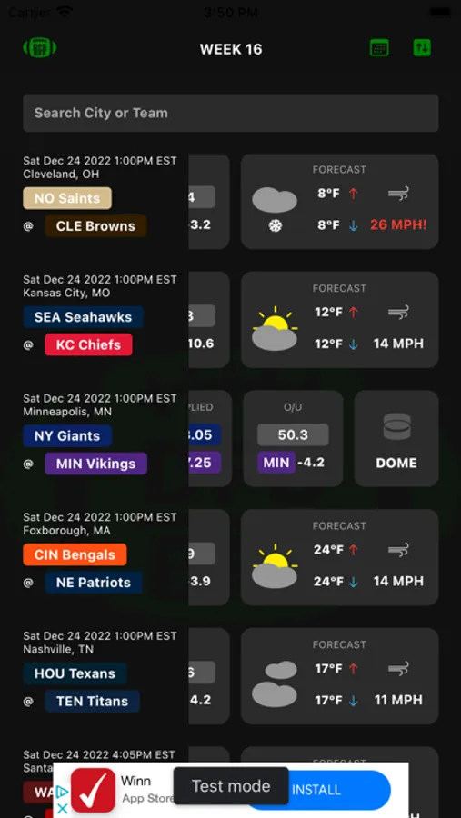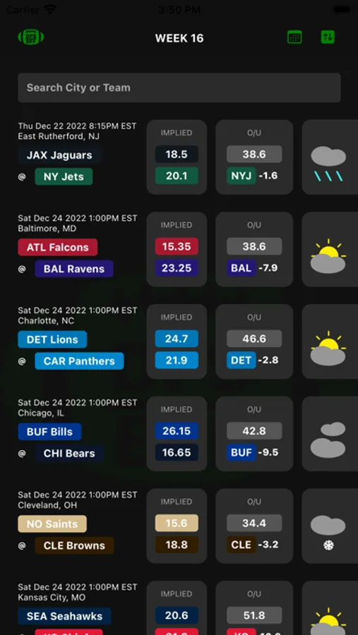 DFS BFF is your best friend for Daily Fantasy Football or an extra tool in your arsenal for making fantasy football start/sit decisions. View the current week of games with all the essential information you need in one single app: game totals, team implied totals, and forecasted weather conditions including wind. Easily get the vital data you need by sorting the slate of games by date, game total, or team implied total.