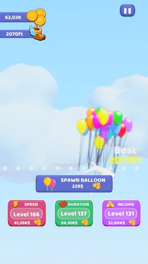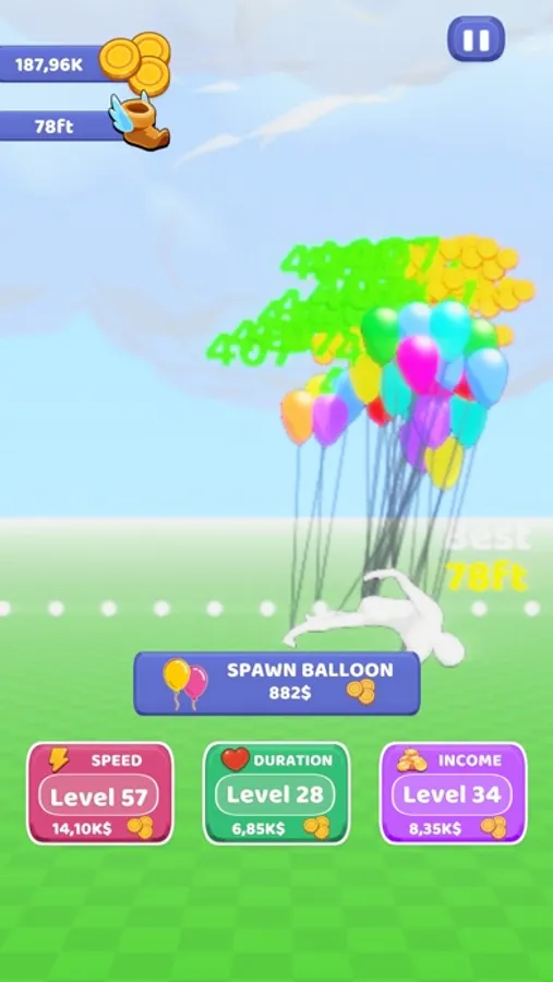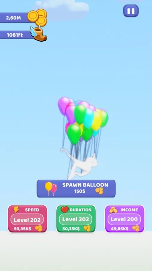 Ever wondered what would happen if you tie a balloon to your hand? Worry no more, we made it possible in this game! This power comes with a great responsibility! Incrementally upgrade your balloons duration, speed and increase your income and rise above the clouds.