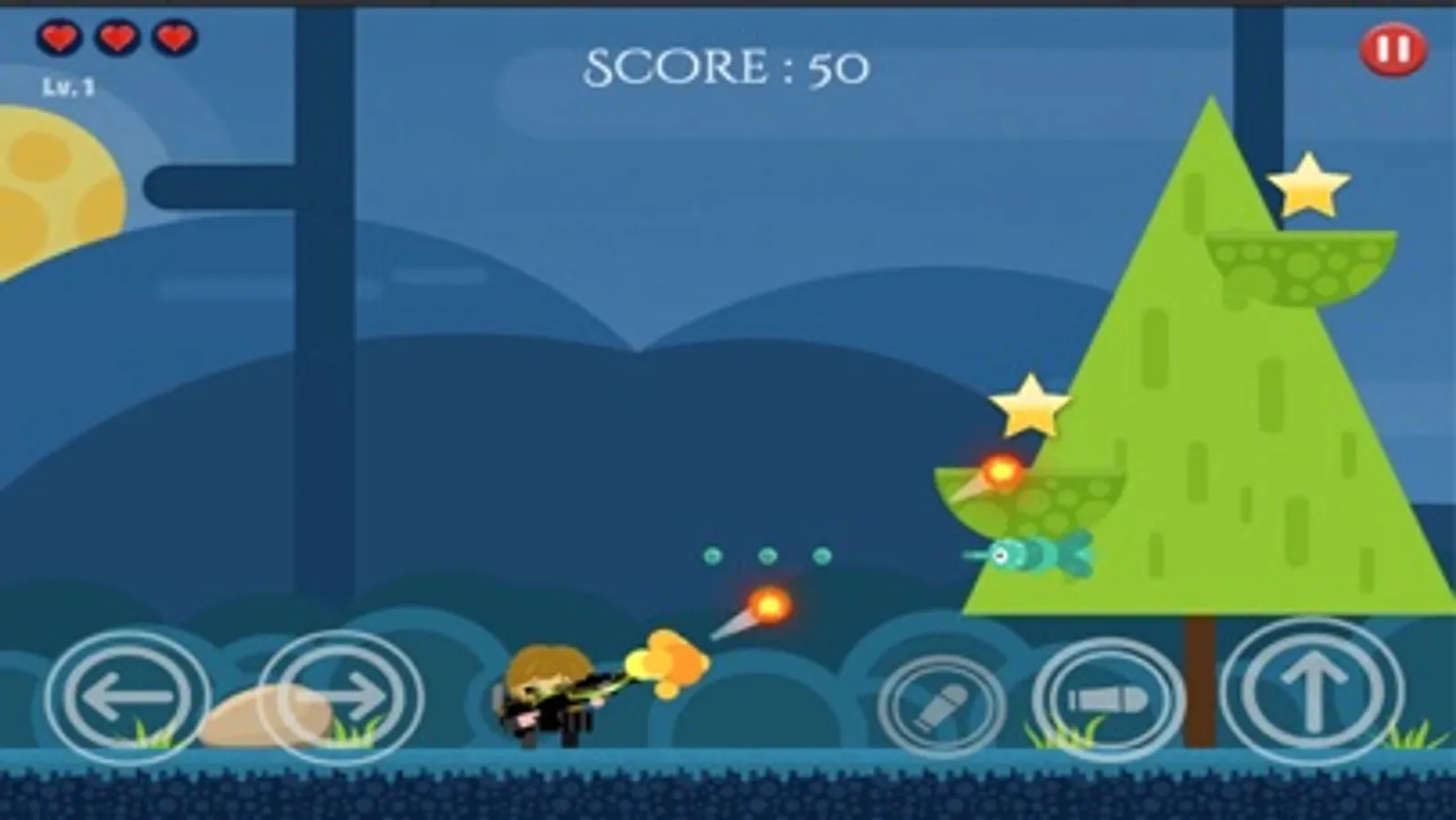 Player can Jump, Run and Shoot. You can collect Stars which increase your score, Power-Ups like increasing the power of the player gun, Health gainer which increases the player’s life.