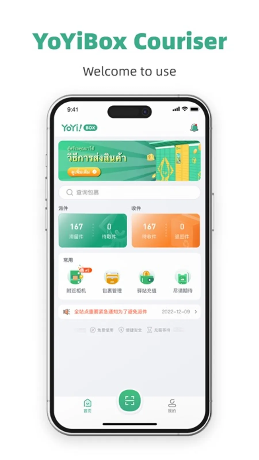 YoYBox Couriser服务广大收派员用户,实现收派件查询、空箱查询、租用预约、我的钱包以及发送短信等功能