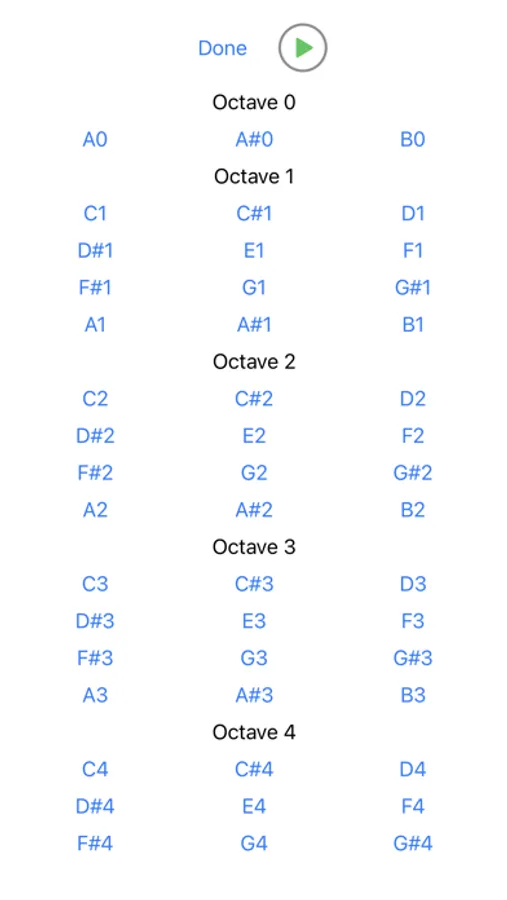 • Selected from a table of note buttons labelled A0 to B8, in the standard piano keyboard and grouped in octave 0 to octave 8