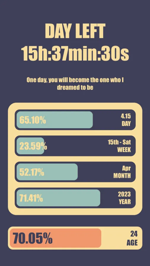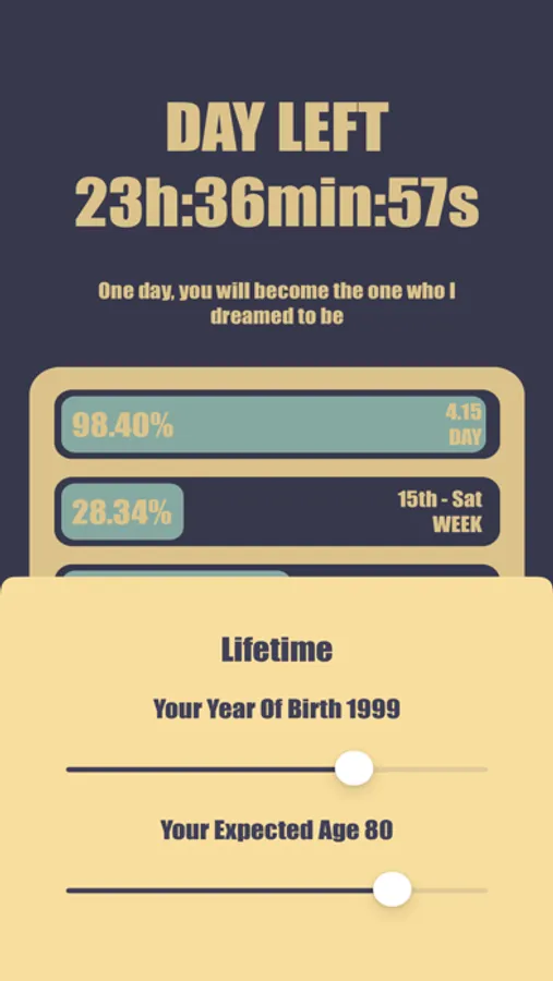 Day Wayfarer is an app that helps users track their life expectancy. It displays how much time is left in a user's day, week, month, year, and overall life expectancy through a progress bar. With Day Wayfarer, users can better plan their time and consciously make the most of each day to achieve their life goals. It is a simple and easy-to-use app that not only motivates users to live positively, but also reminds them to cherish time.
