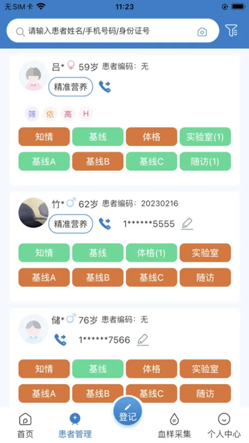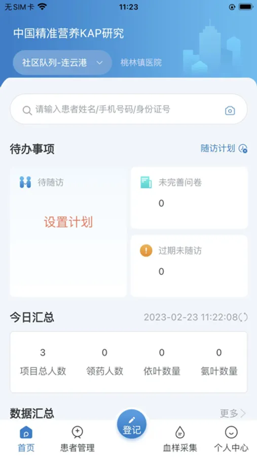 平台功能包含患者登记、患者管理、健康档案、血样采集、个人中心、数据统计。