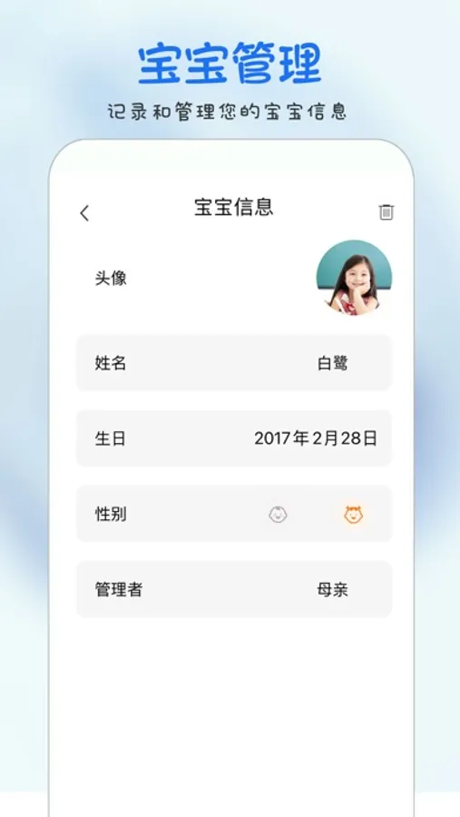 4.成长档案:可记录宝宝的身高,体重,全家福,第一次等。