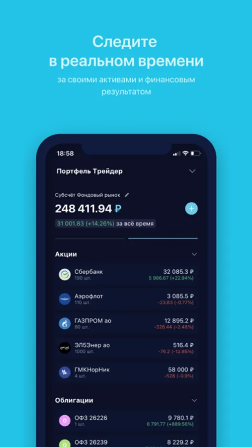 Интерфейс состоит из логичных разделов, где вы можете отслеживать состояние вашего портфеля, анализировать структуру и динамику, создавать различные типы сделок и видеть полную информацию по каждому активу.