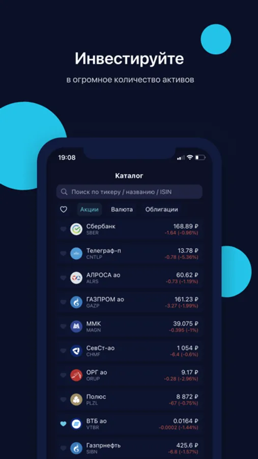 В разделе Каталог у вас будет доступ к широкому спектру финансовых инструментов, включая акции, валюты, облигации, а также быстрый поиск и отслеживание любых активов в один клик.