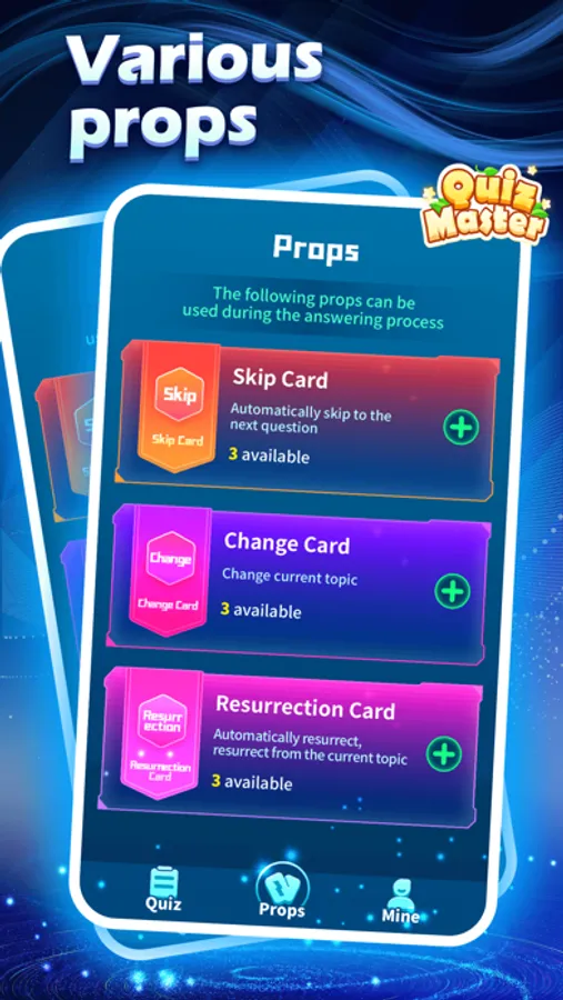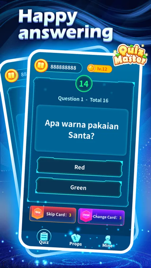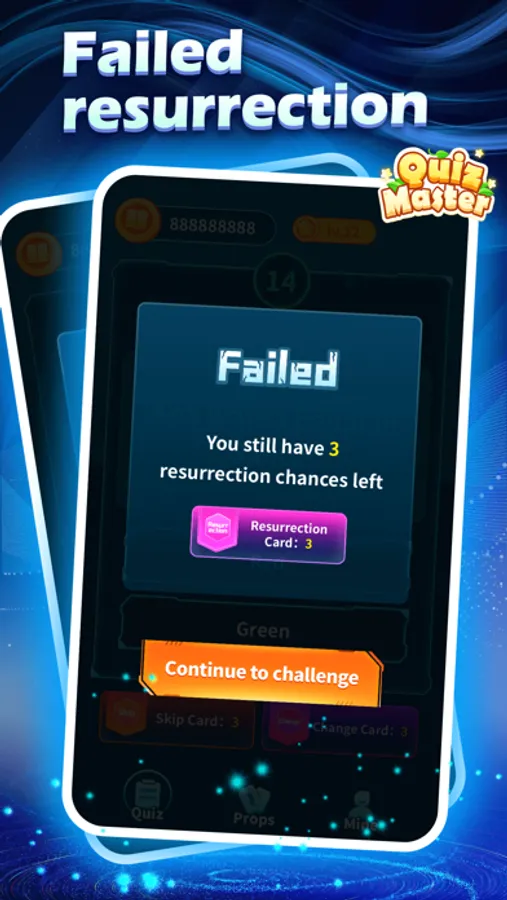 In quiz master, if you choose the correct answer within 12 seconds, you will enter the next question. Answer 12 questions in a row to complete the challenge and enter the next round of challenges; there are 3 kinds of props that you can use when answering the questions, namely, choose to skip the question cards, change cards, resurrection cards, come and try
