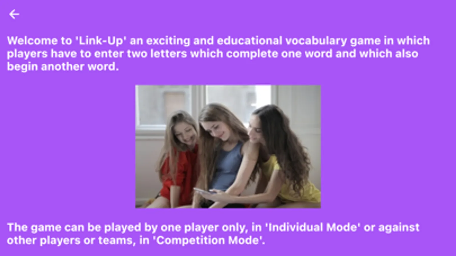 Link-Up for learners of English is an exciting and educational vocabulary game for people learning English and who would like to practice and expand their vocabulary and improve their spelling. In the game, players have to enter two letters which complete one word and which also begin another word. Words are displayed randomly and taken from a database containing over 11,000 combinations. Any unknown words can be looked up in the onboard dictionary. The game is an excellent way of testing your existing knowledge, of learning new vocabulary, of brushing up your spelling and of challenging your brain!