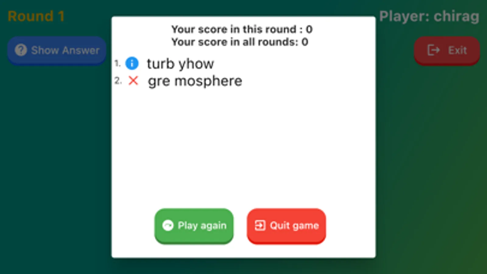 carrot and otherwise If the letters you enter are not correct, you will see a message that tells you that your input is wrong and that you can try again. If you don't know which letters are correct, you can press 'Show answer' and you will see the two complete words with the two missing letters entered. You can click on to any word and see its meaning in the onboard dictionary. You can see your current score as you play, and your total score when you want to exit the game. All of your scores are saved and you can see them the next time you play. There is no time limit in 'Individual Mode'.
