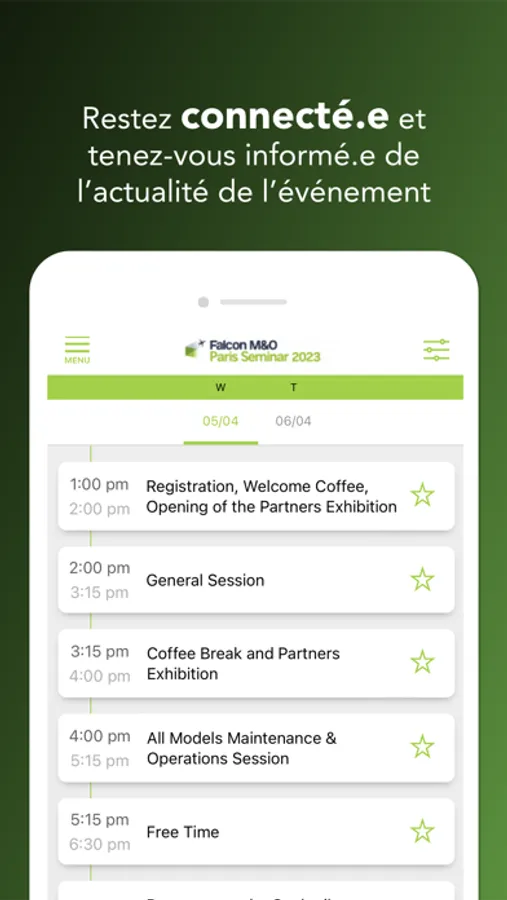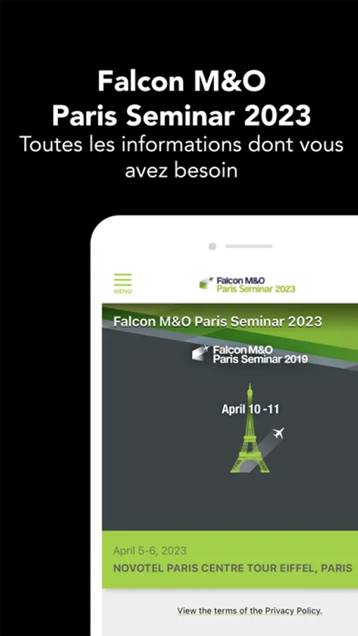 The official mobile app of the 2023 Falcon M&O Paris Seminar provides you with all event content in a mobile format: practical information, detailed schedules, speaker bios, and live quizzes and Q&As. The app enables you to connect with other attendees and make the most of your participation. Other event services such as messaging are also available. Stay connected!
